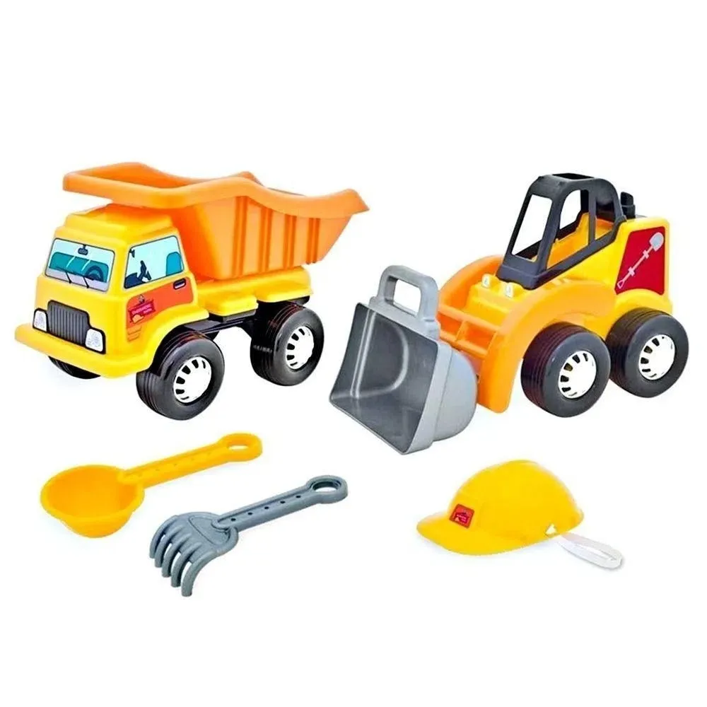 Inclui caminhão com caçamba móvel, trator com pá e braço articulados que levantam/abaixam via manivelas, além de acessórios como capacete de segurança, cones e ferramentas, tudo em plástico resistente e colorido (dimensões aproximadas: 45x30x25 cm).