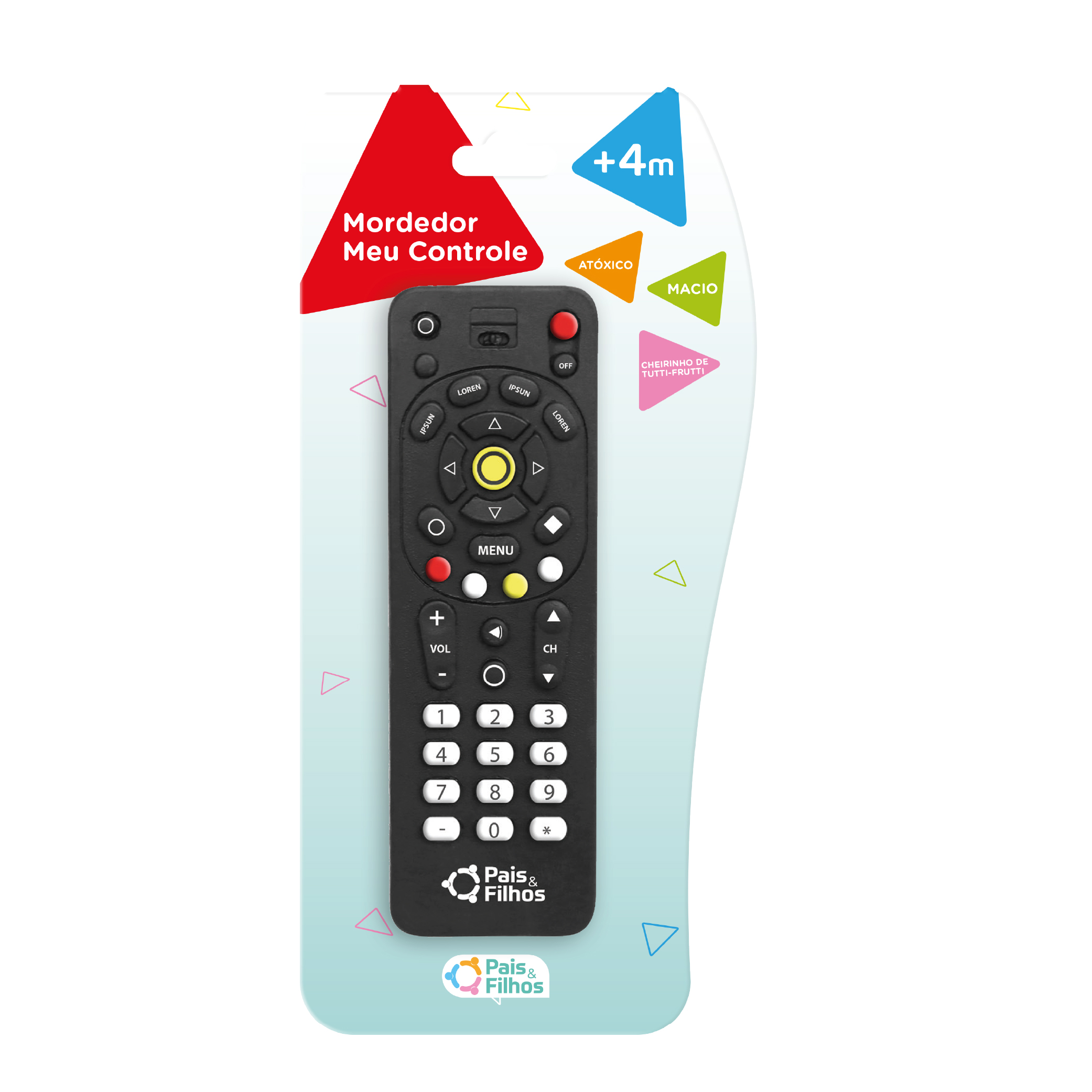 O Mordedor Meu Controle Pais & Filhos é um brinquedo em vinil atóxico moldado como controle remoto, ideal para bebês que roem objetos durante a dentição.