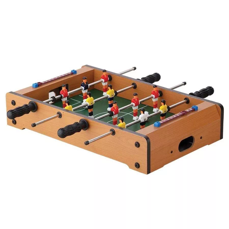 Versão mini ou padrão em plástico resistente, possui 8-12 hastes com bonecos coloridos por time, placar manual, 2 bolinhas e gols em cada ponta; movimente para frente/atrás tentando chutar sem girar excessivamente.