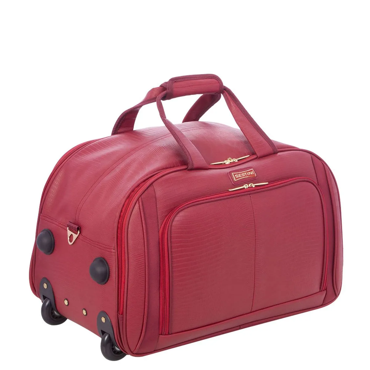 A Sacola com Carrinho Média Croco 4T Vinho da Sestini combina estilo contemporâneo com praticidade máxima para compras, viagens ou dia a dia agitado. Fabricada em PVC e poliéster resistente com acabamento tipo croco, possui carrinho embutido retrátil, alça carona para acoplar em malas, bolso lateral amplo e espaço interno com divisórias e bolso em redinha com zíper.